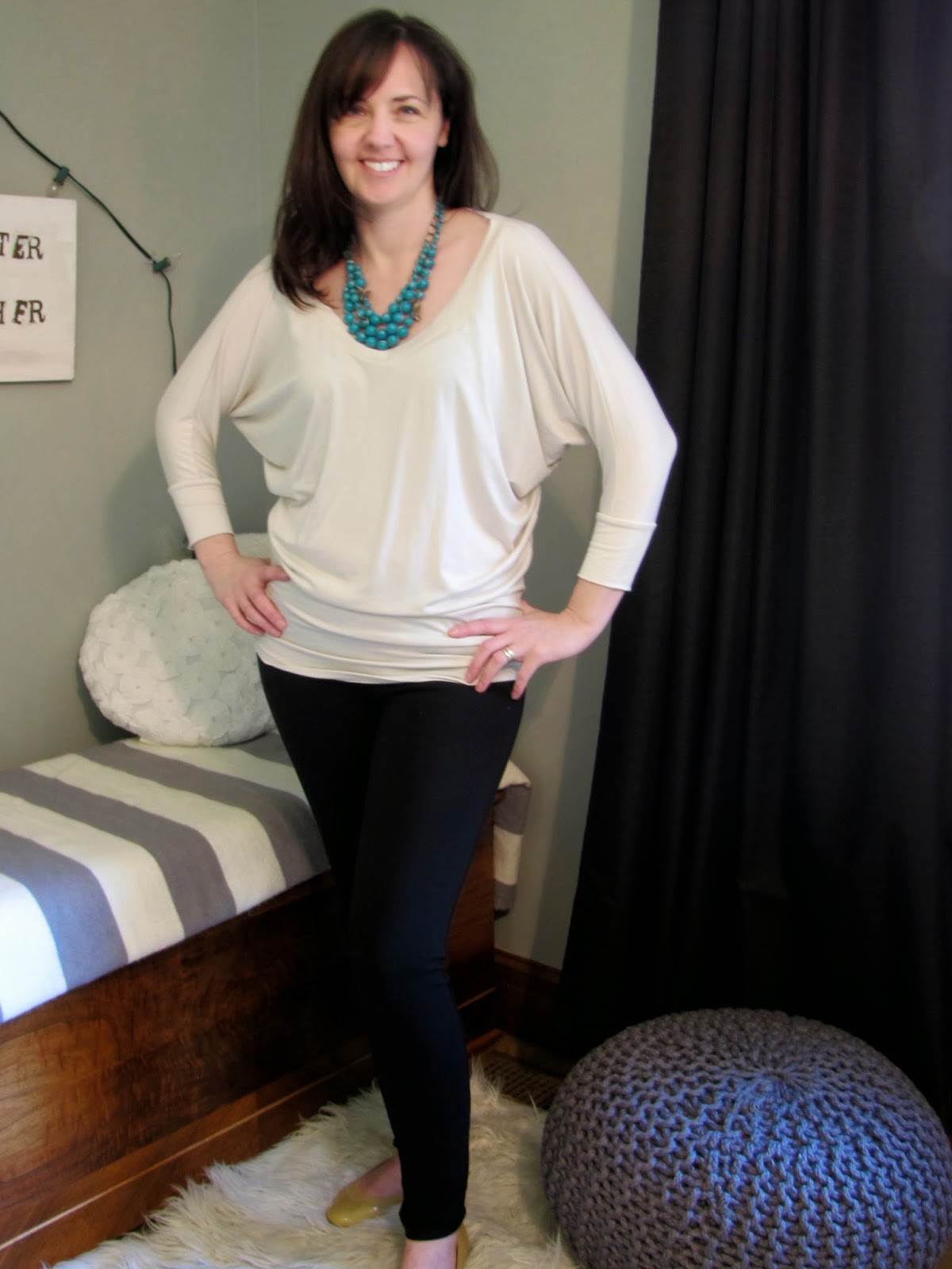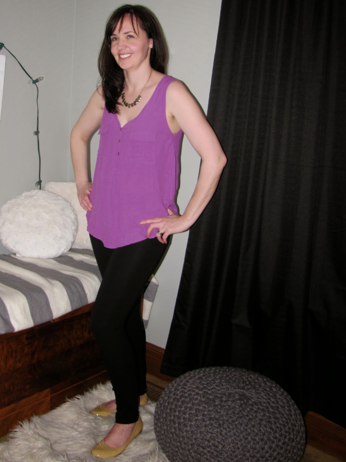 So outfit number one... the purpley tank with pockets and the "pants"... Before we go any further I have to address the fashion issue that could be one of my biggest pet peeves - LEGGINGS ARE NOT PANTS - let me expand on that and say leggings are especially not pants for those of us in the 40+ club. Now having said that if you want to continue to subscribe to the notion that leggings are not pants DO NOT buy these leggings - OH! MY! WORD! So comfortable that they make me simply want to buy long tunics and only tops that cover my bottom so I can wear them every day. They are thicker than typical leggings and my girls even asked if they were jeans when I modeled them for them. So forgive me if you see me committing this fashion faux pas - I'm sorry they are just so comfy.